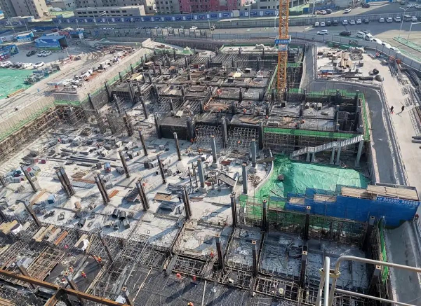 走进工地,一个巨大的基坑映入眼帘,随处都是忙碌施工的工人和大型器械。伴着微微轰鸣声,3台塔吊正在接续不断地向基坑内吊运建筑材料,工人们正在进行地下一层、地下二层的钢筋绑扎作业,工程进展紧张有序、忙而不乱。